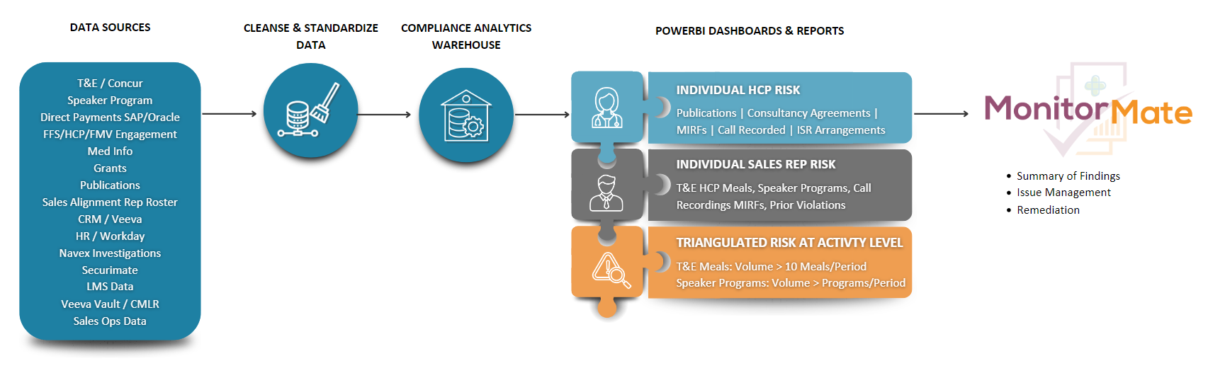 Metrics – such as meals with repeat attendees, meals exceeding limit, speaker program with less HCPs, cancelled programs with paid Fee for Service, incentive compensation variance compared to prior period, MIRFS variance compared to prior period, and more – aid in identifying KRIs for sales representatives and HCPs. Consolidating these KRIs provides a comprehensive view of the overall risk.