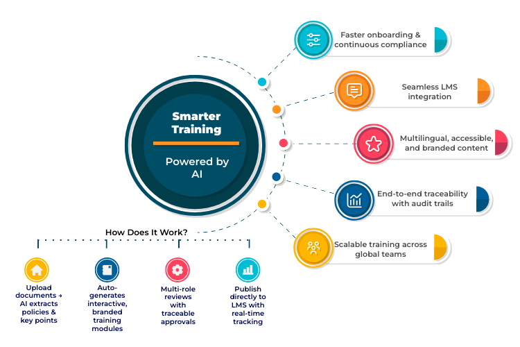 Creating compliant training by hand takes weeks and is hard to keep aligned with evolving policies. Stakeholder reviews are fragmented, versioning is error-prone, and tracking completions across systems is inconsistent, increasing audit risk and delaying onboarding.